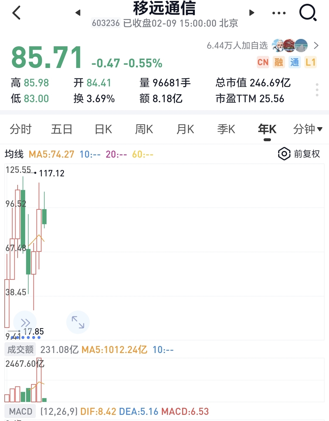 $移远通信(SH603236)$ 年K每年都留长下影,主力有这癖好吗