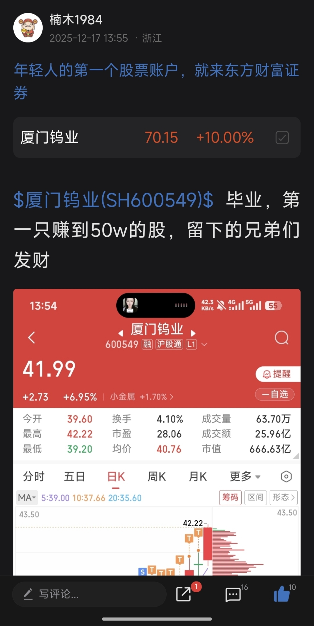 $移远通信(SH603236)$ 去年10月华友50让古大师买,古大师不买还天天骂我,自己到我主页看看我厦钨什么时候发的帖,翔鹭什么时候发的帖,就你也配在那分析?