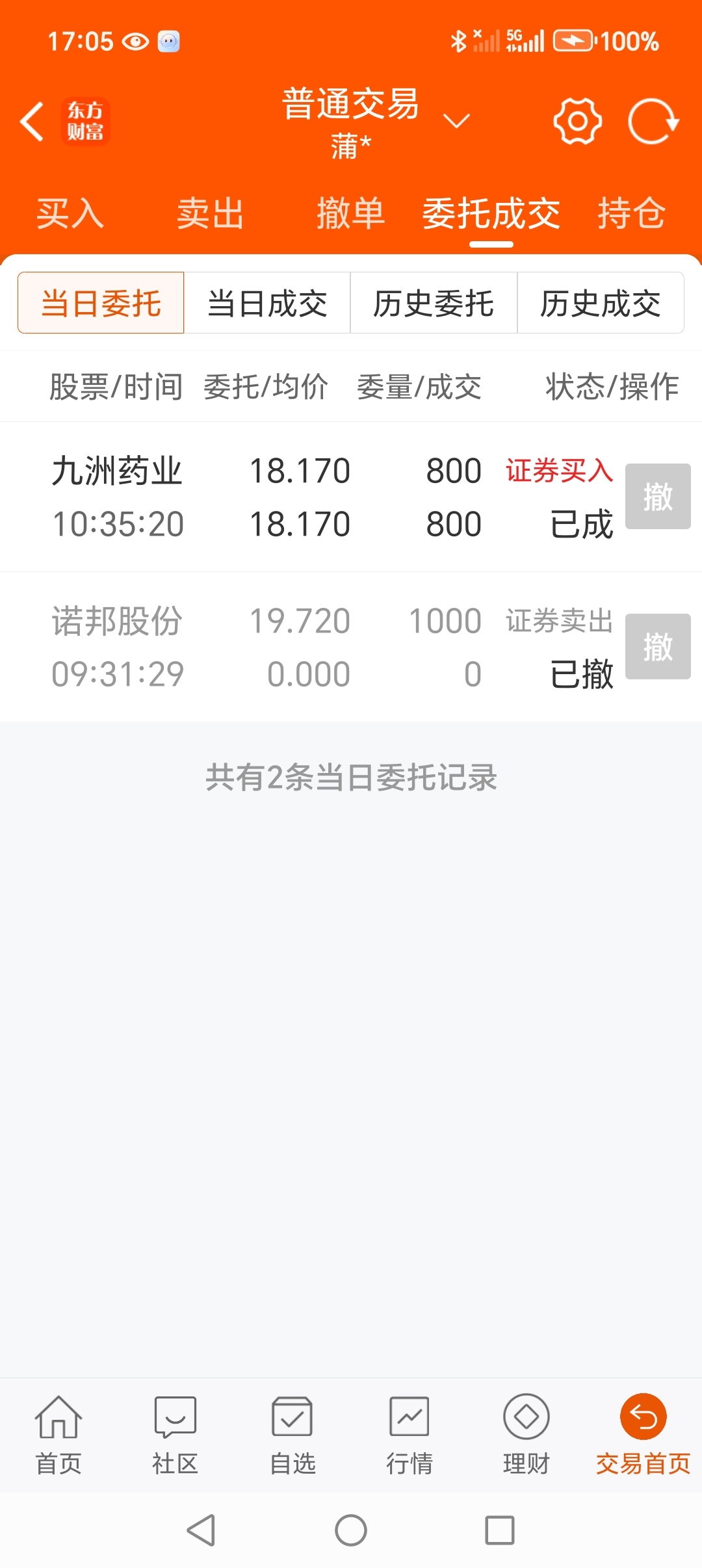 $诺邦股份(SH603238)$ $九洲药业(SH603456)$ 全天就交易一笔买单,早上挂了个19.72元昨天高位,搏的是万一吃走100%会跳水,那么等跳水就买回来。既然卖不出去就算了,明天如果行业指数反弹就不能挂这价了。