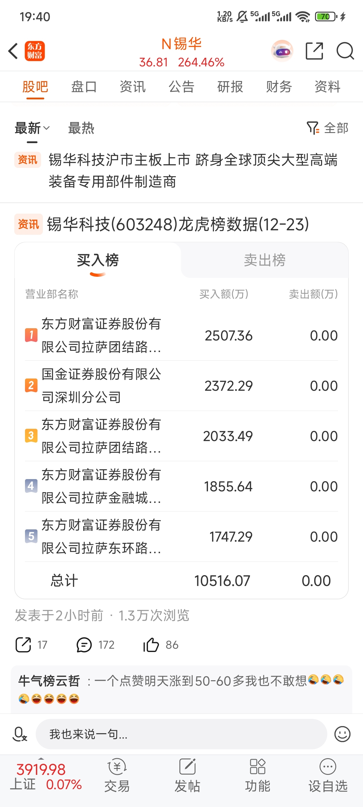 $N锡华(SH603248)$ 问一个龙虎榜的问题。前5的买家都是拉萨,看着好像都是家人,但卖出数量都是0,真正的家人不可能没有卖出数量的,是不是说明前5的买家是主力用拉萨的账号?大家有明白的没,来讨论一下,要买入的前5真的是主力,那明天是不是就稳了?