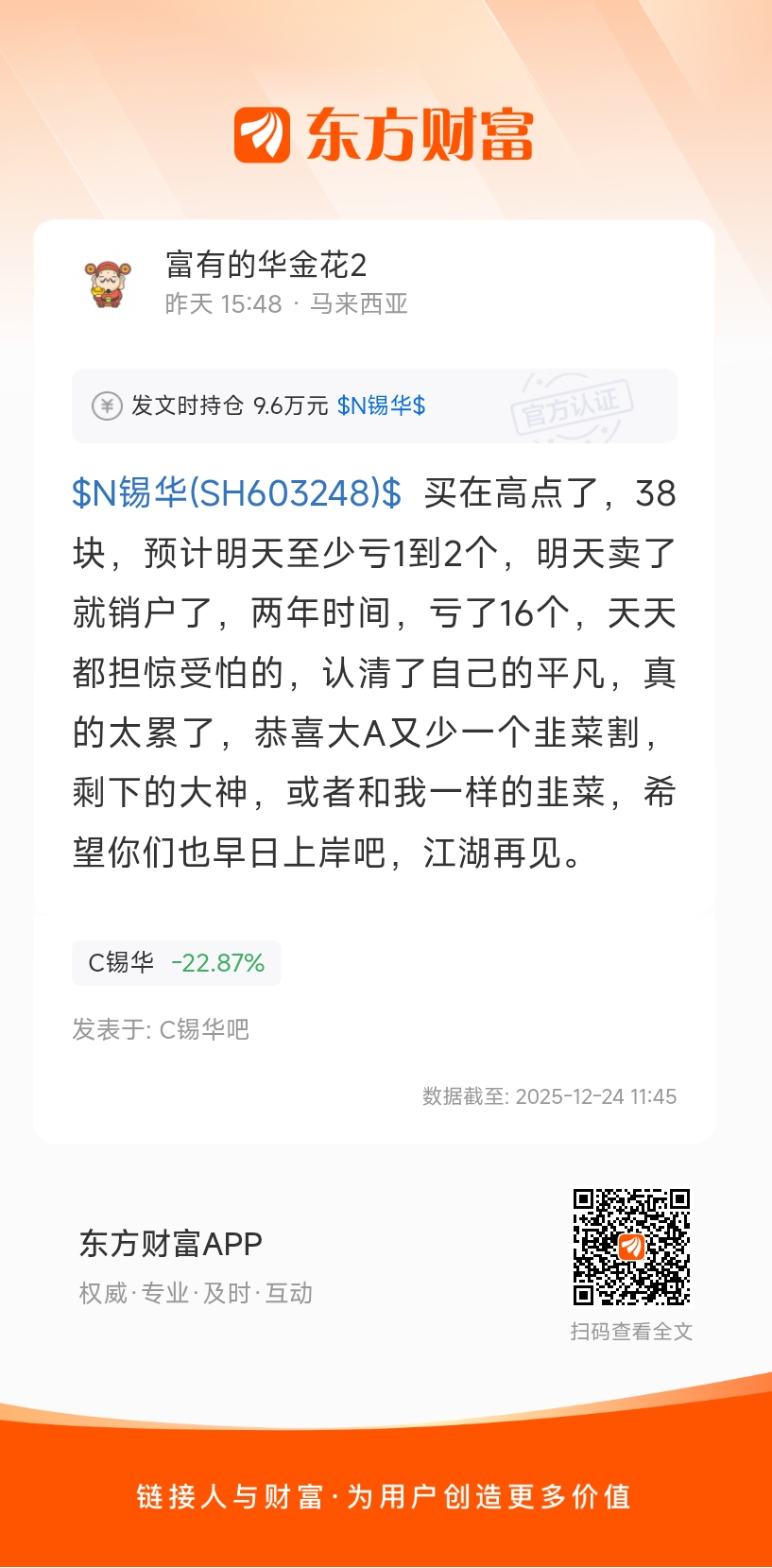 $N锡华(SH603248)$ 买在高点了,38块,预计明天至少亏1到2个,明天卖了就销户了,两年时间,亏了16个,天天都担惊受怕的,认清了自己的平凡,真的太累了,恭喜大A又少一个韭菜割,剩下的大神,或者和我一样的韭菜,希望你们也早日上岸吧,江湖再见。
