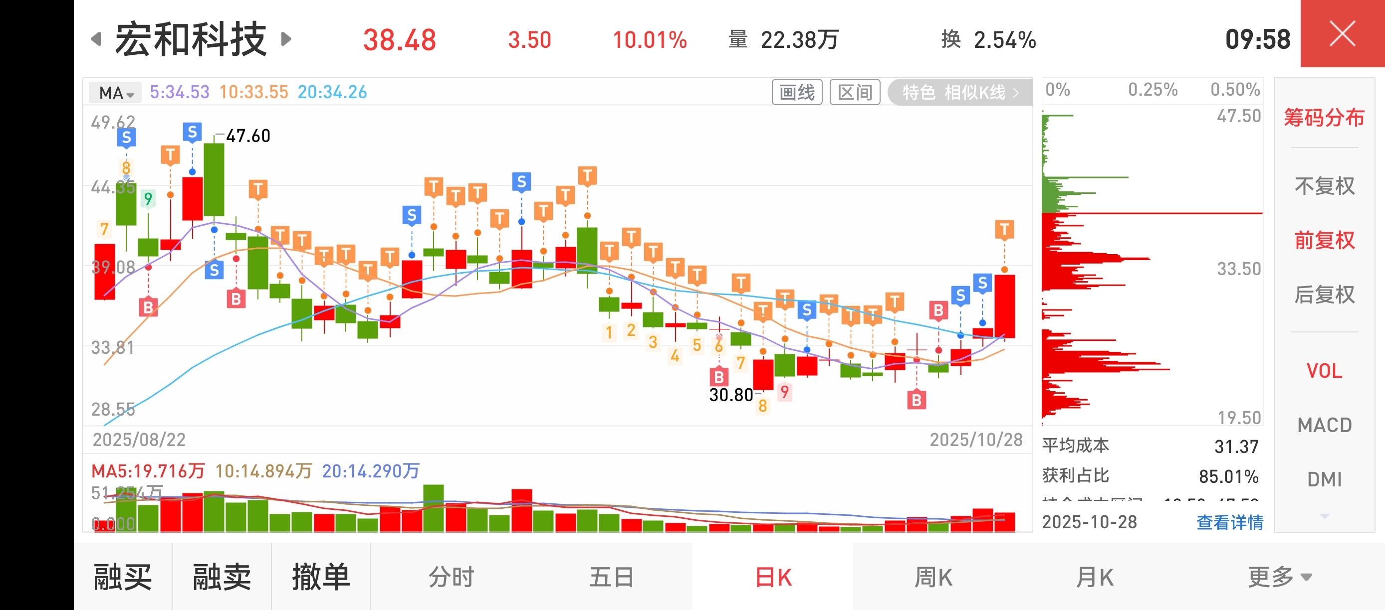 今天预料到了大阳线,涨停没想到。原因很简单,胜宏三季报不及预期,环比下降,主要原因就是上游原材料供不应求,涨价幅度大,尤其是电子布,资金认可宏和也就顺理成章了。