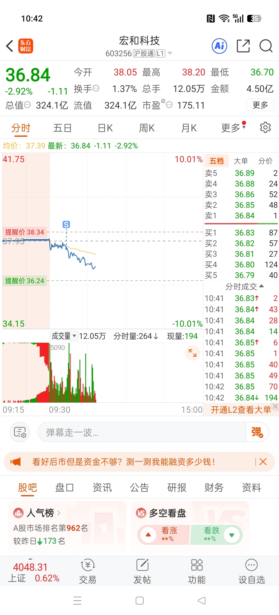 $宏和科技(SH603256)$ 天天36.24支撑点T票吸筹,不喜欢做T,