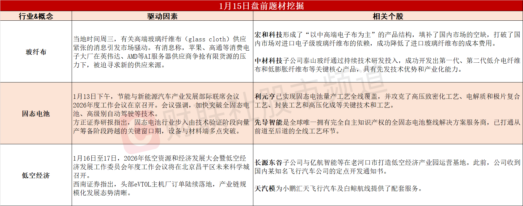 ①PCB关键原材料玻纤布供应紧张,特种玻纤布迎量价齐升趋势。②工信部提出加快突破全固态电池技术,产业链迎来发展关键窗口期。③国家战略聚焦低空经济新赛道,机构称产业链规模化发展态势清晰。