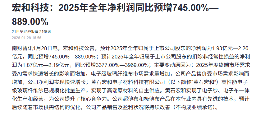 宏和科技:2025年净利同比预增745%-889%,电子级玻璃纤维布市场需求量增加