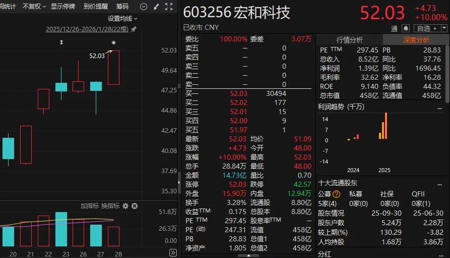 宏和科技预计2025年度盈利同比大增。该股今日强势涨停。