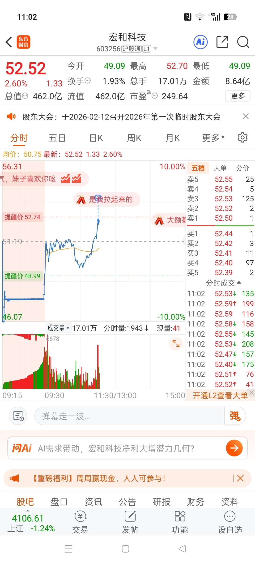 $宏和科技(SH603256)$ 冲高的一两个点不等了