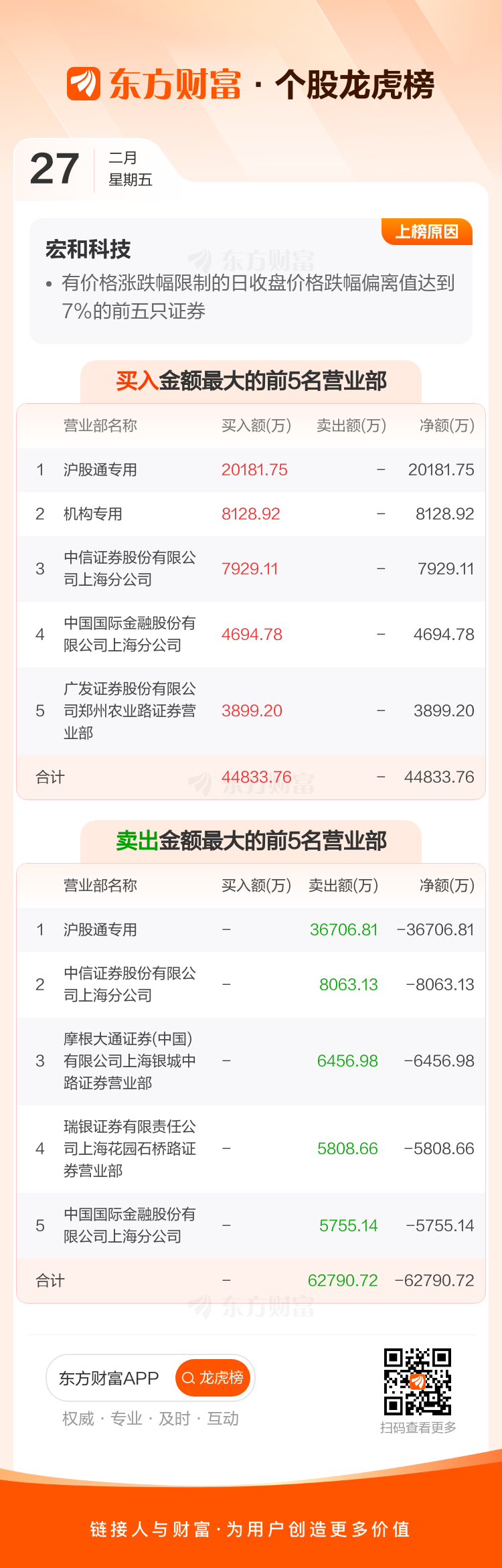 交易所2026年2月27日公布的交易公开信息显示,宏和科技因成为有价格涨跌幅限制的日收盘价格跌幅偏离值达到7%的前五只证券上榜。宏和科技当日收报79.79元,涨跌幅-6.74%,偏离值-7.14%,换手率5.24%,成交额36.38亿。
