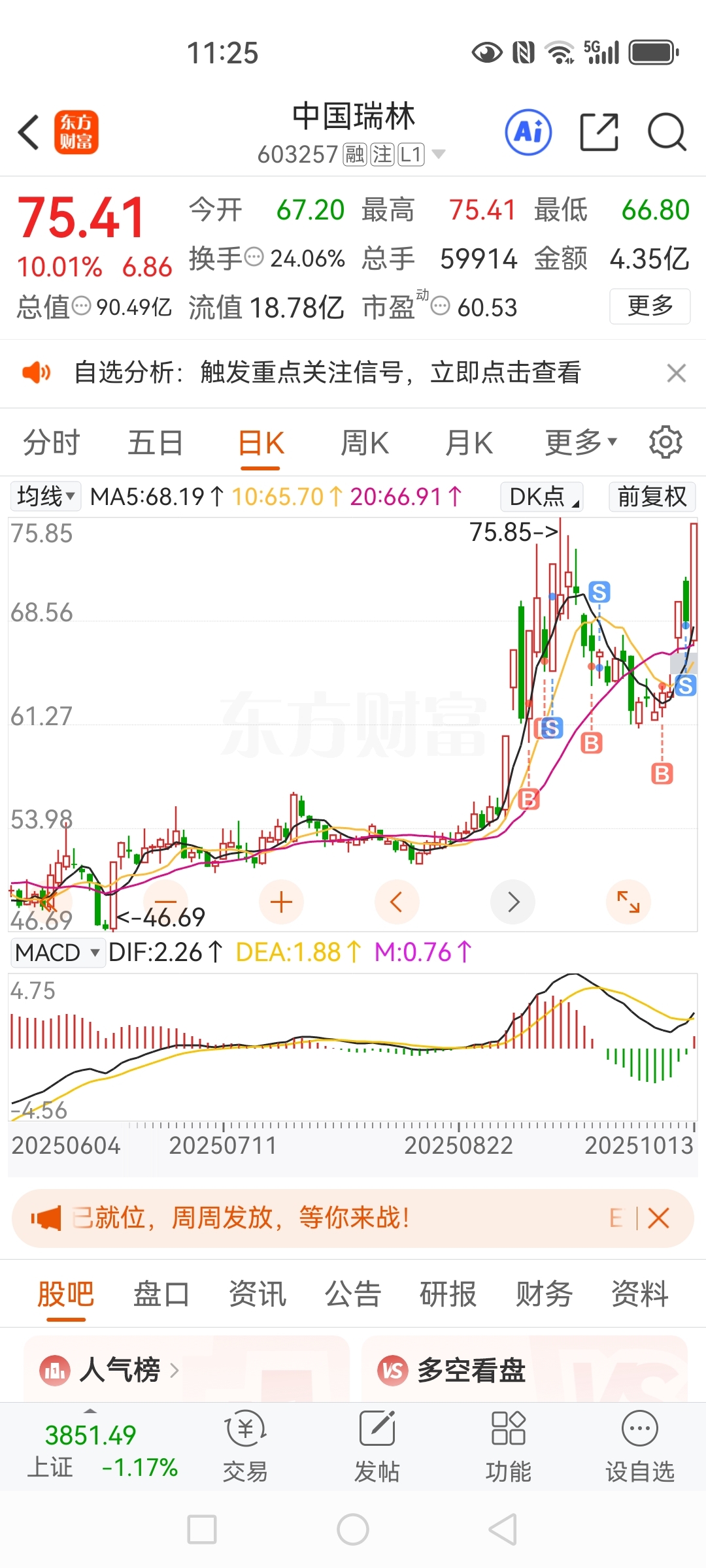 $中国瑞林(SH603257)$ 周五没有坚持住,少赚一千五