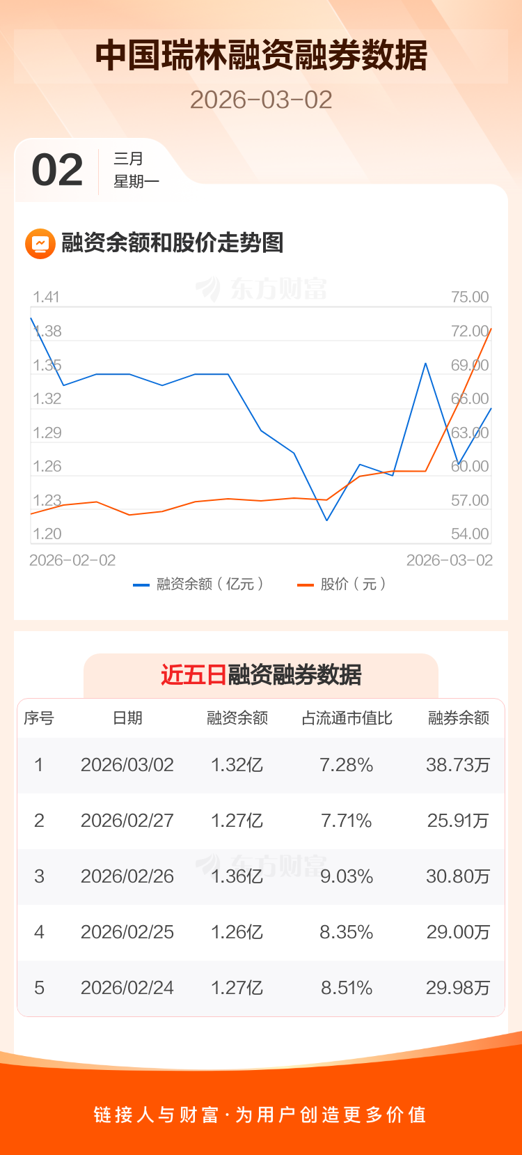 交易所最新数据显示,中国瑞林于2026年3月2日获融资买入5936.41万元,融资偿还5438.73万元,当日融资净买入497.68万元。目前,该股融资余额1.32亿,占流通市值比例为7.28%。