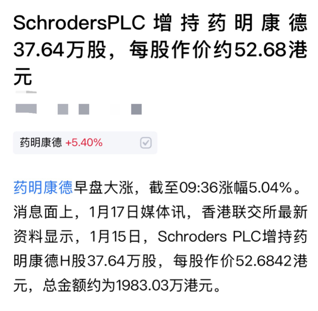 消息面上,1月17日媒体讯,香港联交所最新资料显示,1月15日,Schroders PLC增持药明康德H股37.64万股,每股作价52.6842港元,总金额约为1983.03万港元。