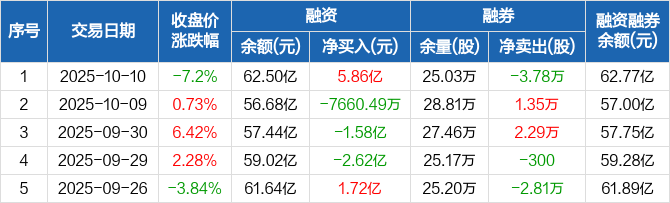 融资方面,当日融资买入10.86亿元,融资偿还5.01亿元,融资净买入5.86亿元。融券方面,融券卖出1.33万股,融券偿还5.11万股,融券余量25.03万股,融券余额2620.69万元。融资融券余额合计62.77亿元。