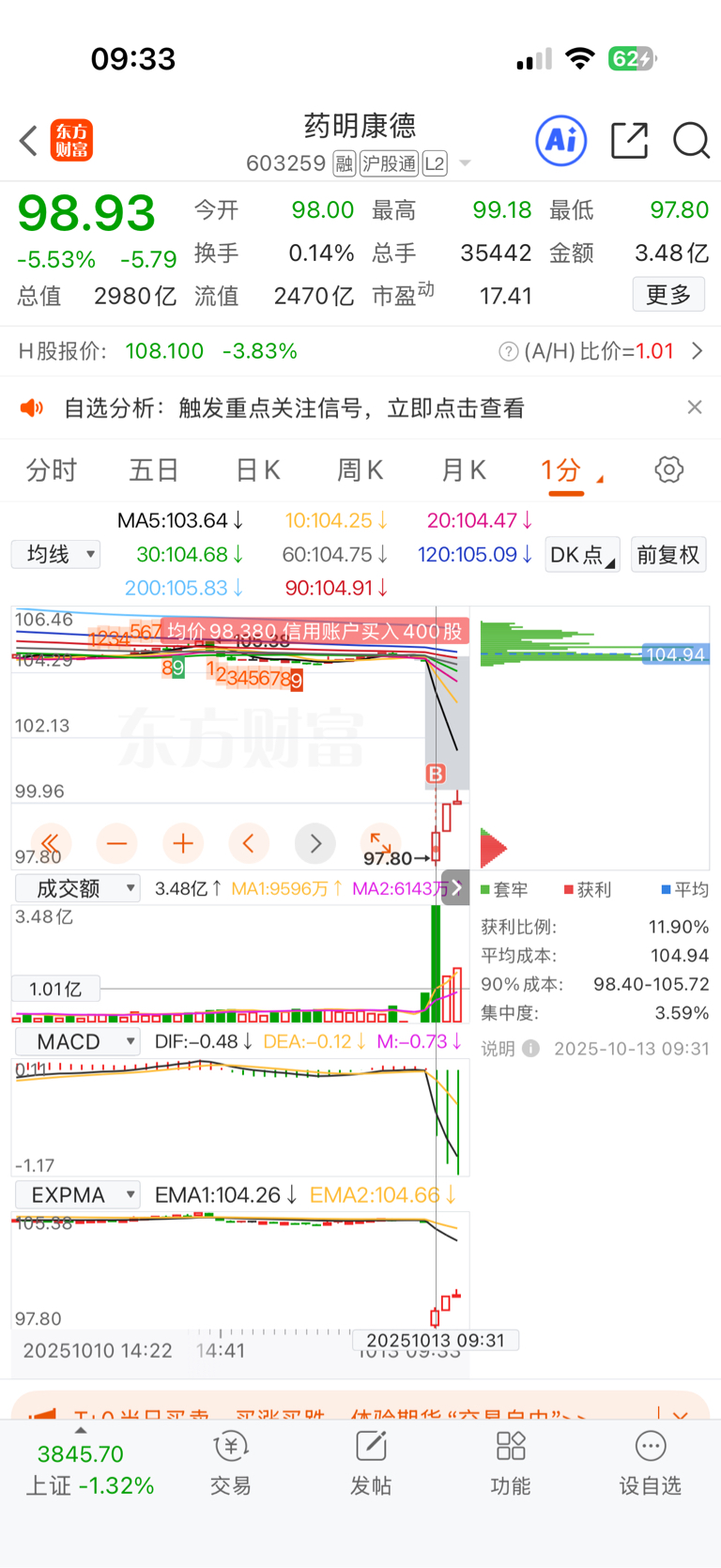$药明康德(SH603259)$ 情绪差不多到位,即将变盘,昨天抄了几手,耐心耐心还是耐心!