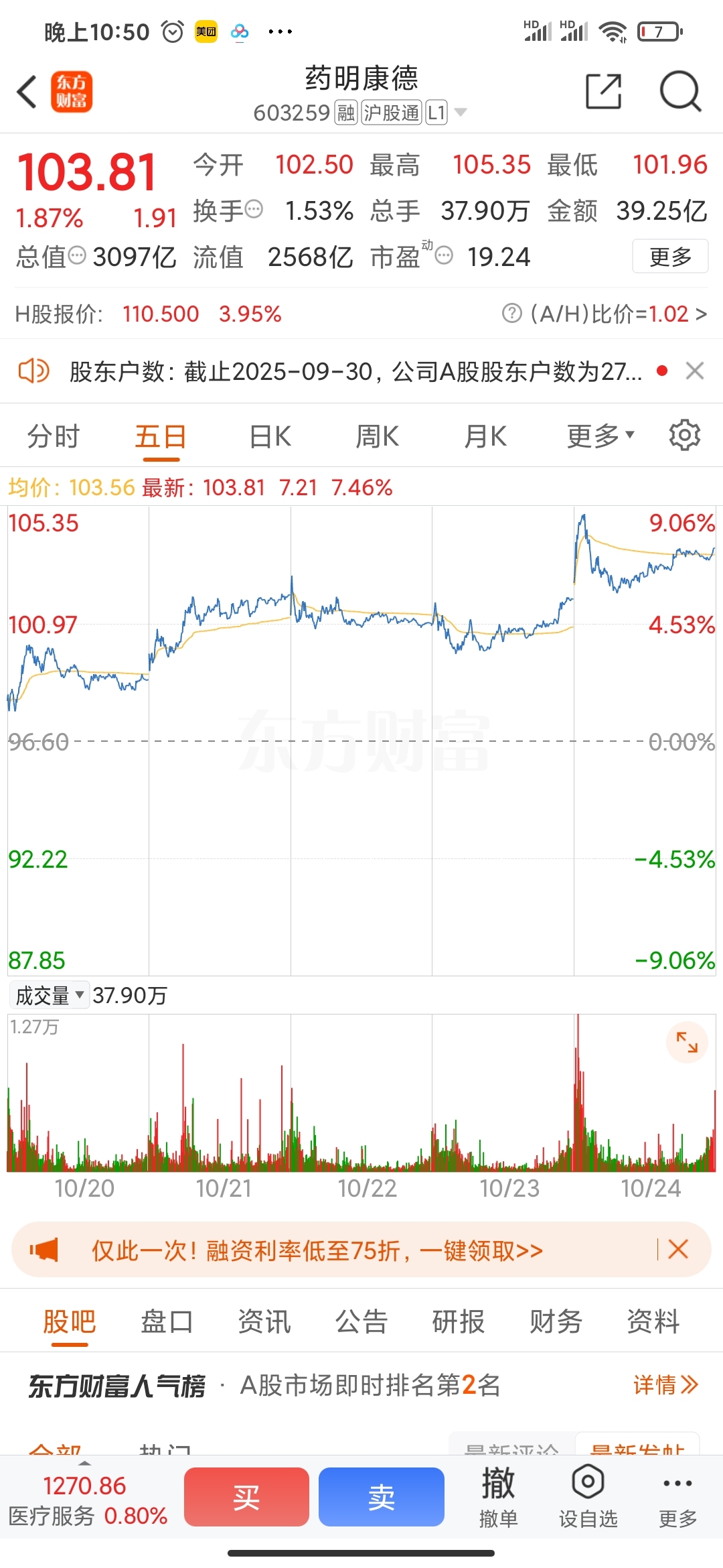 $药明康德(SH603259)$ 人气这么高看样子明天要板的样子