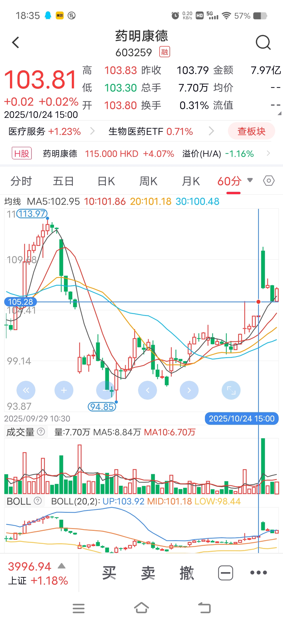 $药明康德(SH603259)$ 今天跳空高开后回调,补上缺口后,返身向上。