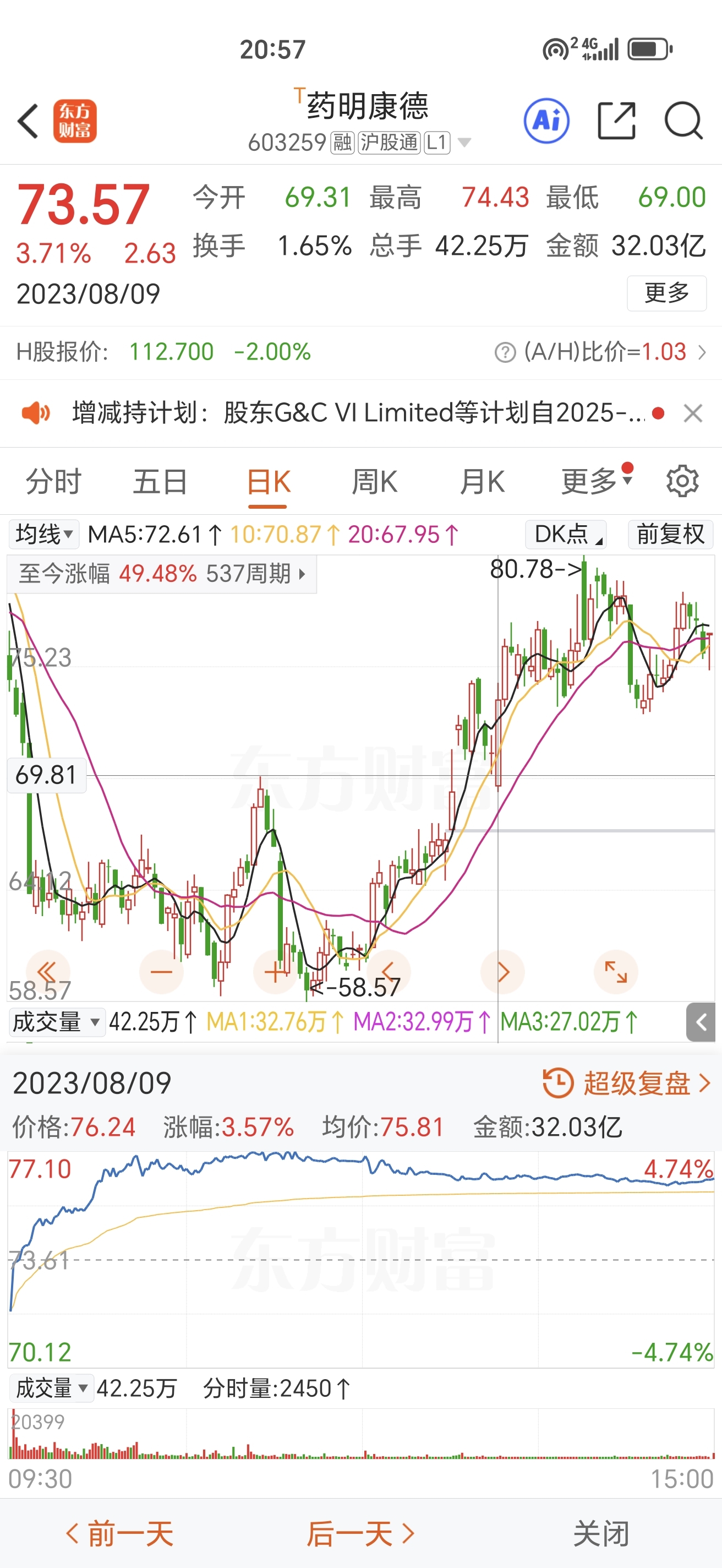 $药明康德(SH603259)$ 2023年8月9号公告大股东减持不超过总股本的1%后首个交易日股价是低开高走的。明天会复制历史走势吗?
