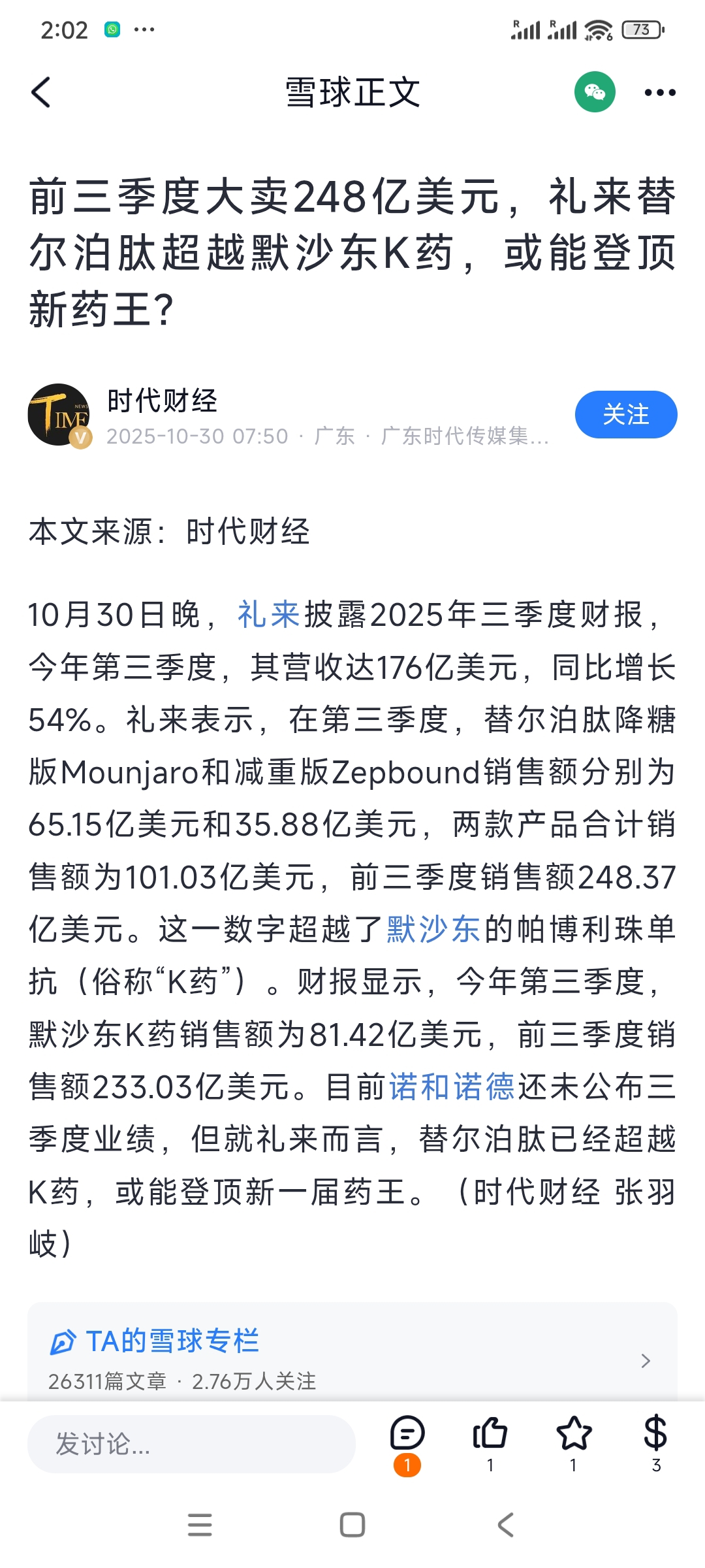 $药明康德(SH603259)$ 礼来替尔泊肽前前三季度或登顶新药王,药明康德多肽产能三季度已达10万升,未来TIDES订单增速还有什么可担心的