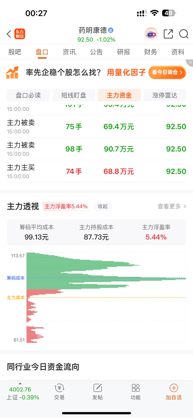 $药明康德(SH603259)$ 快震到主力成本价了。目测村里是想要把获利盘给震完一大部分。你去看药明的财报,无论是收益率还是其他都相当好,按科技股的尿性,药明翻个倍也根本不过分。