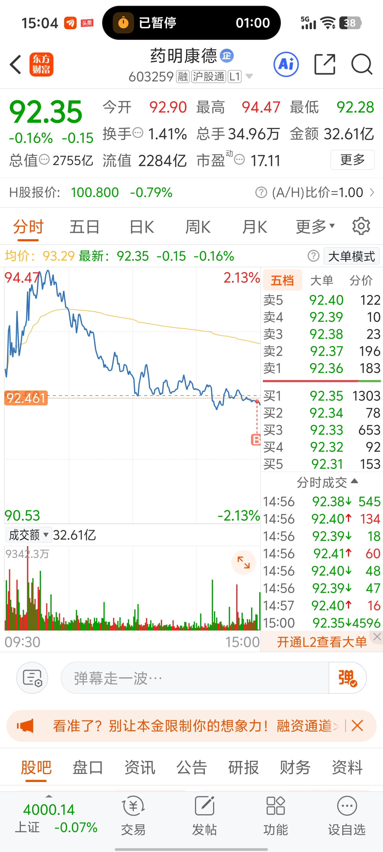 $药明康德(SH603259)$ 借了信用卡7万块钱,临近收盘最后5分钟钱终于到账,手忙脚乱还是抢进去了,兄弟们祝我好运吧