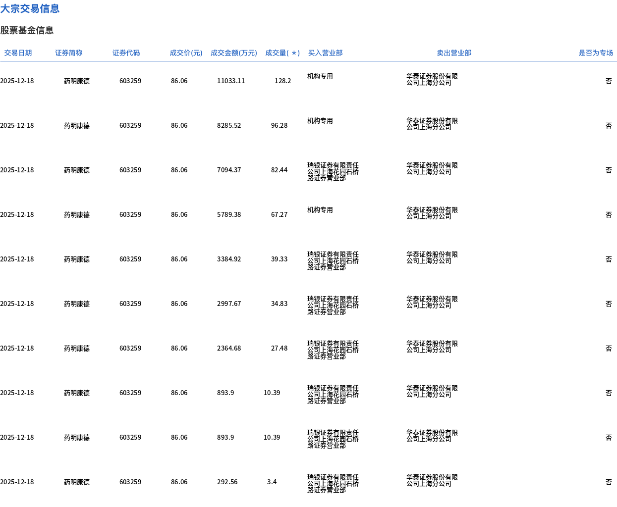 12月18日,药明康德大宗交易成交500.01万股,成交额4.3亿元,占当日总成交额的14.16%,成交价86.06元,较市场收盘价90.59元折价5%。