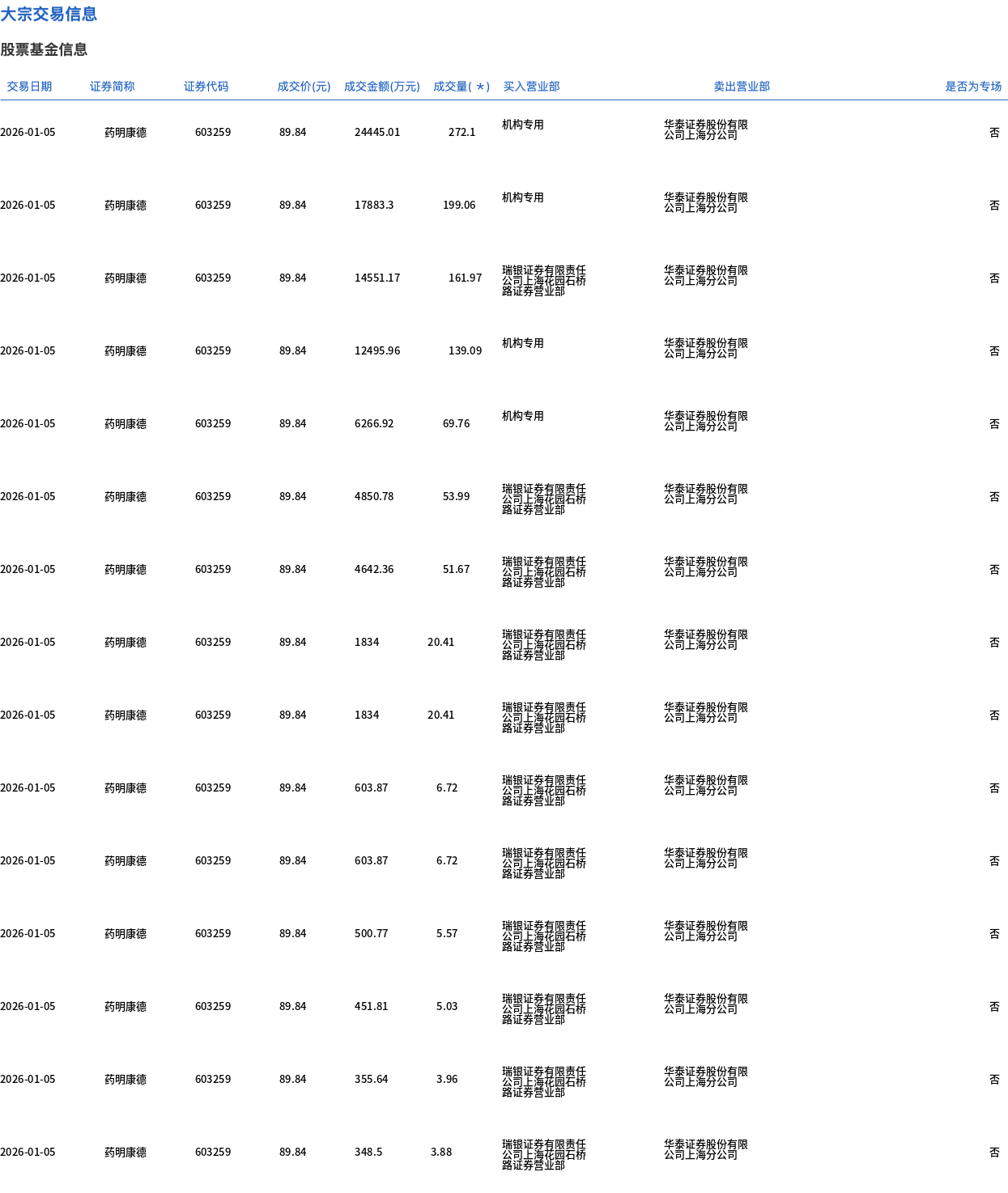 药明康德今日大宗交易折价成交1033.84万股,成交额9.29亿元