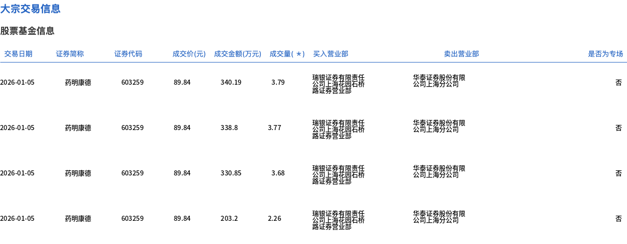 1月5日,药明康德大宗交易成交1033.84万股,成交额9.29亿元,占当日总成交额的11.89%,成交价89.84元,较市场收盘价94.57元折价5%。