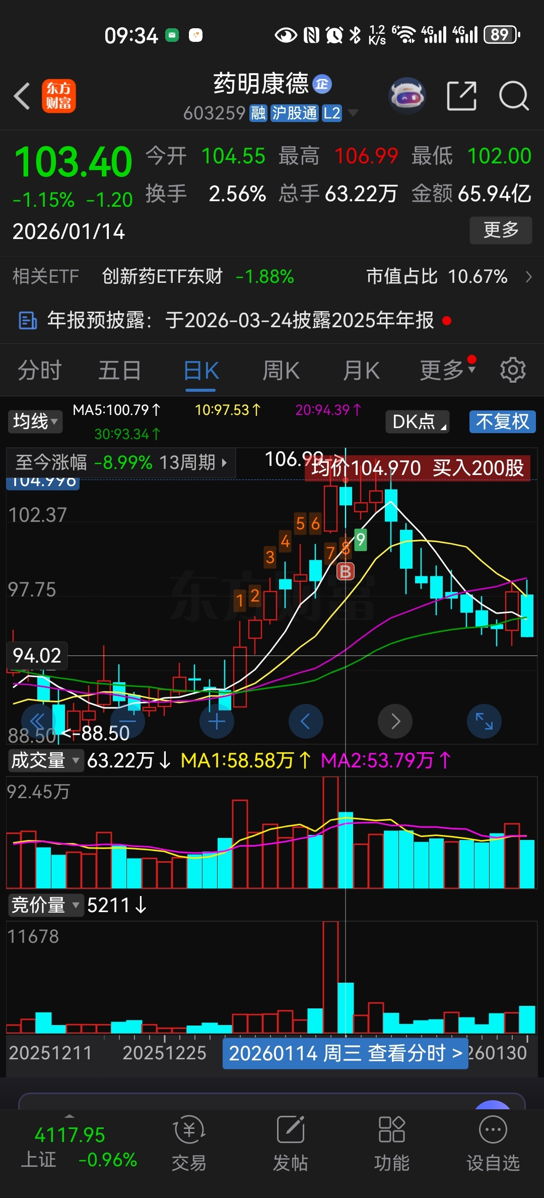 $药明康德(SH603259)$ 知道最近为什么下跌吗?因为在最近最高点的时候我买入了!我微操着世界经济命脉。我很久都没有操作了,那天午盘休盘的时候,我在食堂排队,挂单买入2只股票,另外一个重仓,午休完起来的时候,两只股票都成交了,然后一看大跳水了