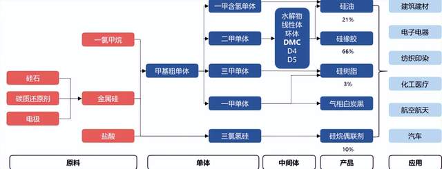 如果我们把有机硅的产业链拆开,你会发现其上游主要是金属硅,中游为单体及中间体,下游包括硅橡胶、硅油、树脂等深加工产品。