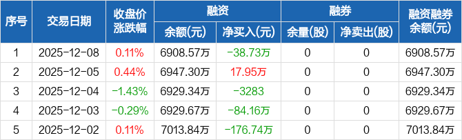 技源集团:融资净偿还38.73万元,融资余额6908.57万元(12-08)