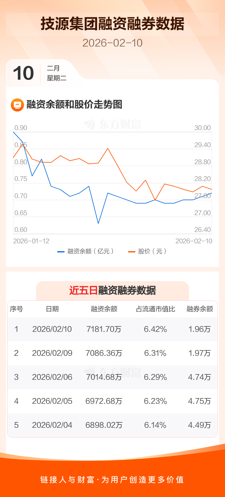 交易所最新数据显示,技源集团于2026年2月10日获融资买入508.39万元,融资偿还413.05万元,当日融资净买入95.34万元。目前,该股融资余额7181.70万,占流通市值比例为6.42%。