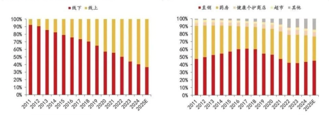 2011-2025E膳食营养补充剂 线下渠道各类型占比(右)