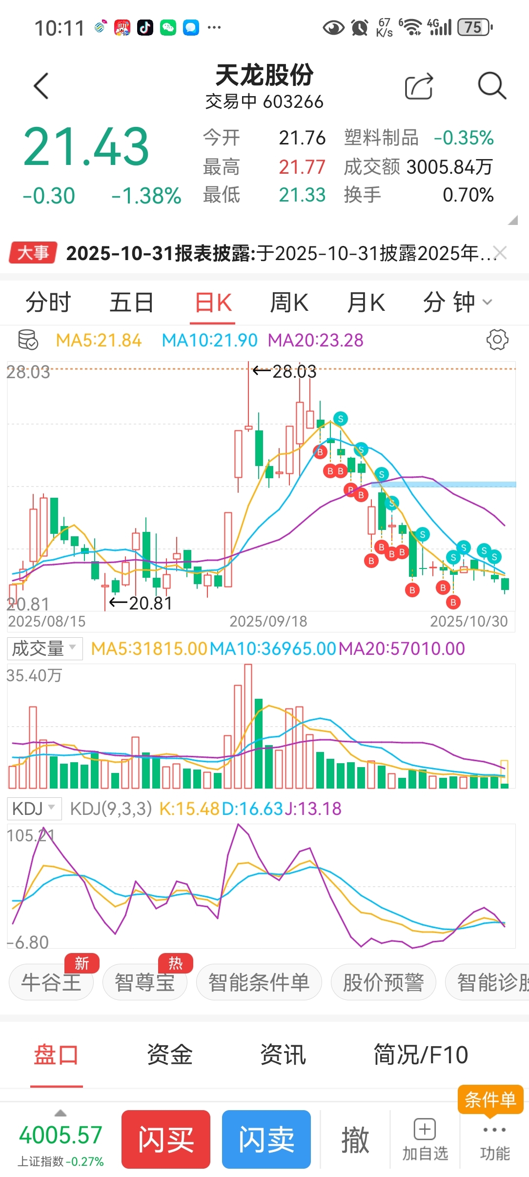 $天龙股份(SH603266)$ 越补越砸盘,这几天根本做不了T,越来越低。没子弹打了