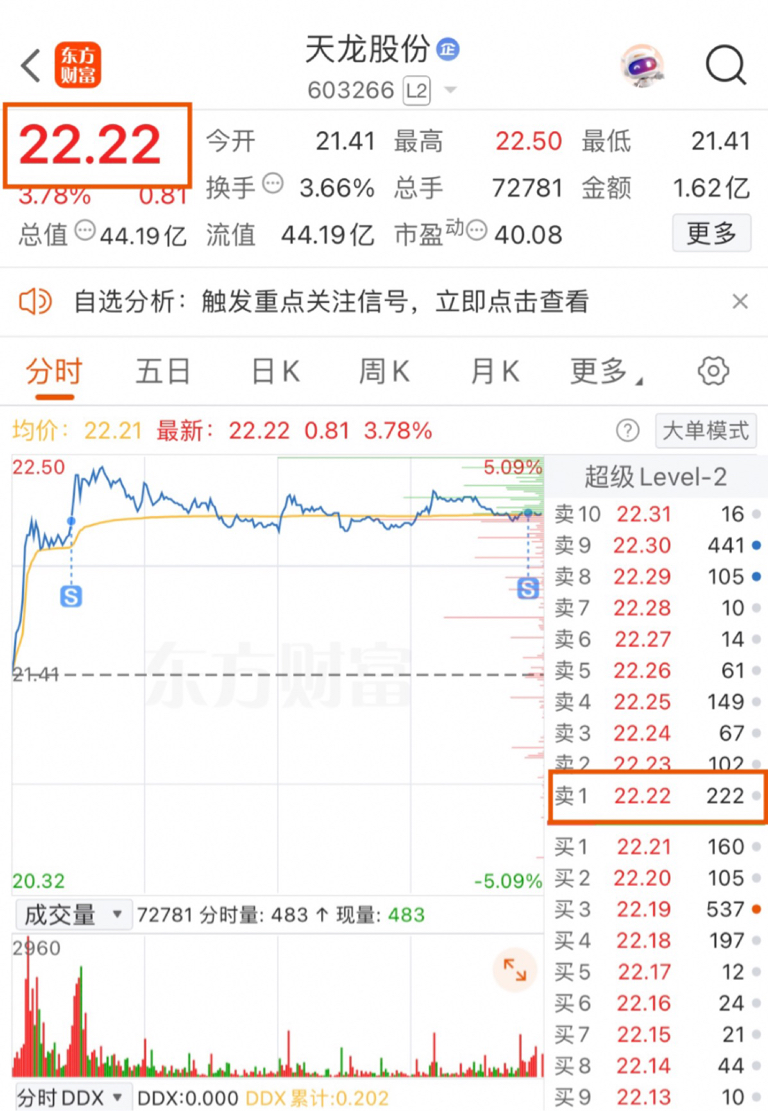 $天龙股份(SH603266)$ 收盘价22.22,卖1价22.22还是222手,这主力是真二!