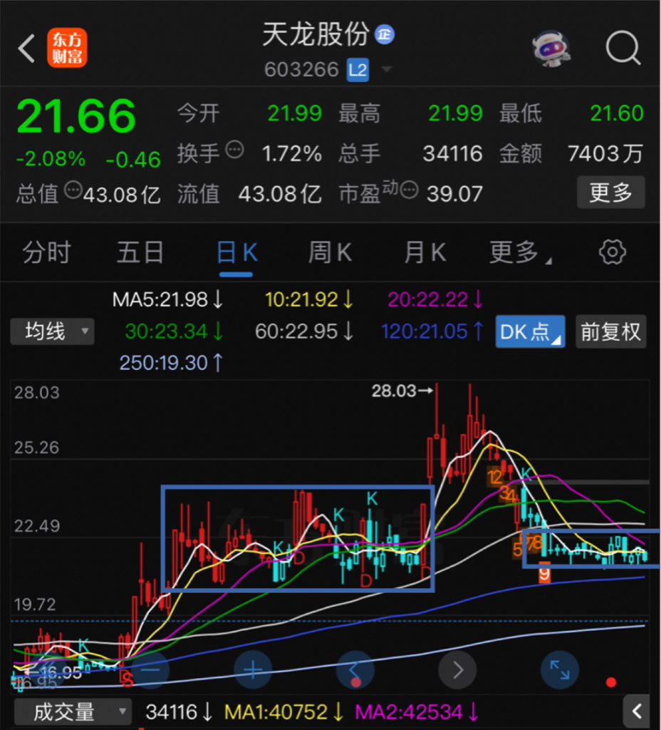 $天龙股份(SH603266)$ 如果主力要做一个对称的图形出来,那么这个位置横盘的周期还没结束,可能还要横盘20个交易日左右才能决定方向!上一次横盘还有点振幅,这次振幅更小,控盘力度更强,说明主力既不想把股价砸到自己的持仓成本以下,又想要散户交出筹码,只有熬了,最后肯定是散户受不了主动交出筹码!