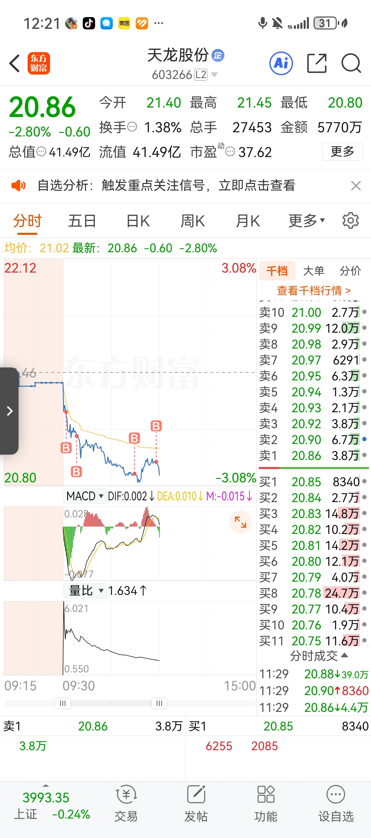 $天龙股份(SH603266)$ 不错,第一价位到了,继续买入,希望主力在给低一点,