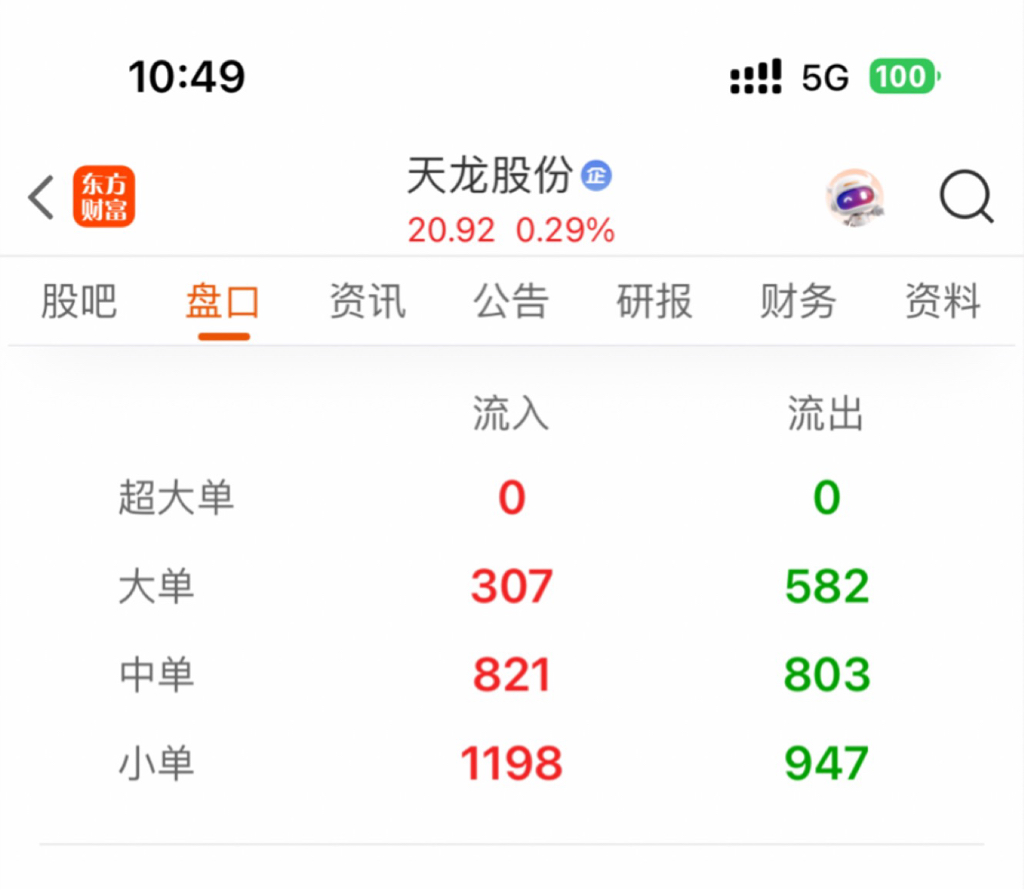 $天龙股份(SH603266)$ 超大单为0,还有人说主力今天在出货!今天就是小散多杀多在割肉!今天的低点大概率就是阶段底部了!