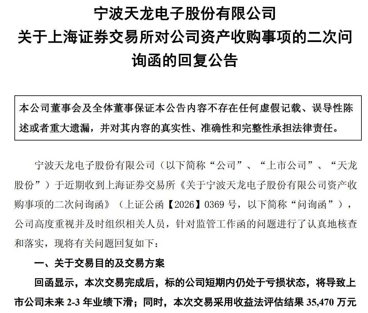 2月11日,天龙股份发布了对上交所二次问询函的回复公告,就监管关注的交易合理性、标的估值、外部投资者退出、内幕信息管理等问题作出回应。