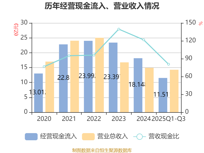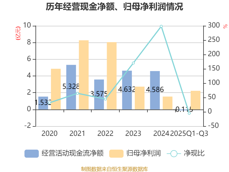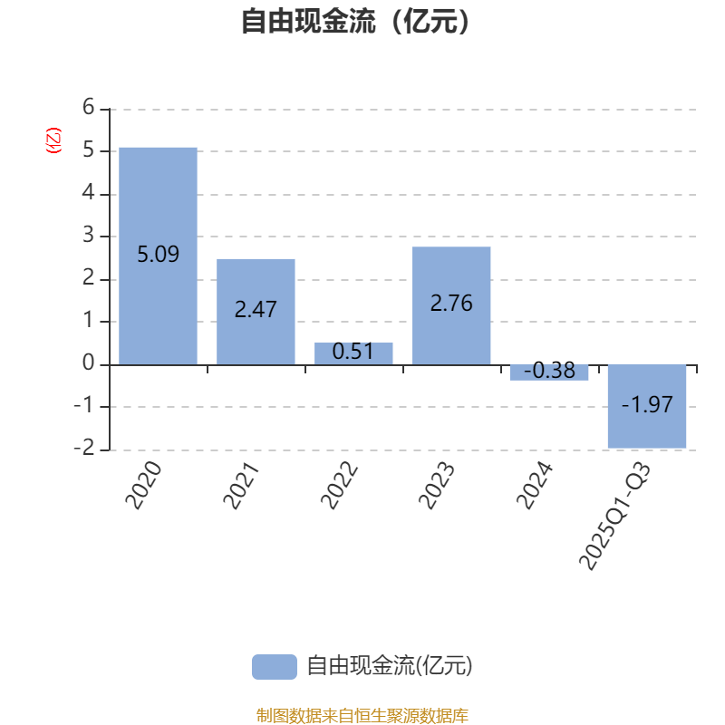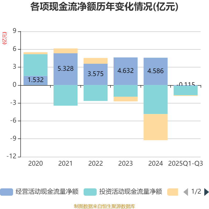 2025年前三季度,公司经营活动现金流净额为-1146.1万元,同比减少1.97亿元;筹资活动现金流净额-1142.97万元,同比增加3.82亿元;投资活动现金流净额-1.59亿元,上年同期为-2.33亿元。