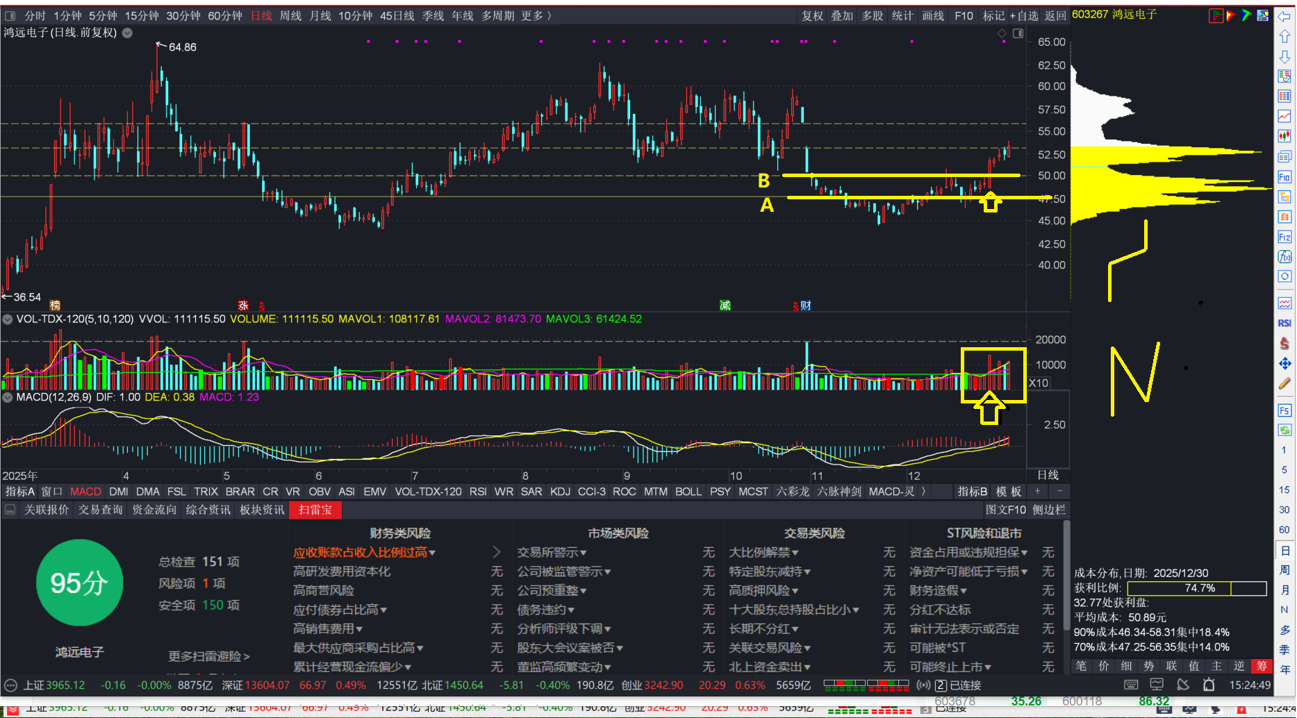 鸿远电子--在底部区差不多有两个月,50元以下收集了60%的筹码。随后在12/24日放量突破,在52.6附近只用了四天就堆积了大量筹码【这里筹码峰有盈利盘和套牢盘】,不管接下来是向上试盘56--57元的压力,还是回调。鸿远电子向上的趋势基本形成,接下来只看大周期,小周期忽略--跌都视为机会!!