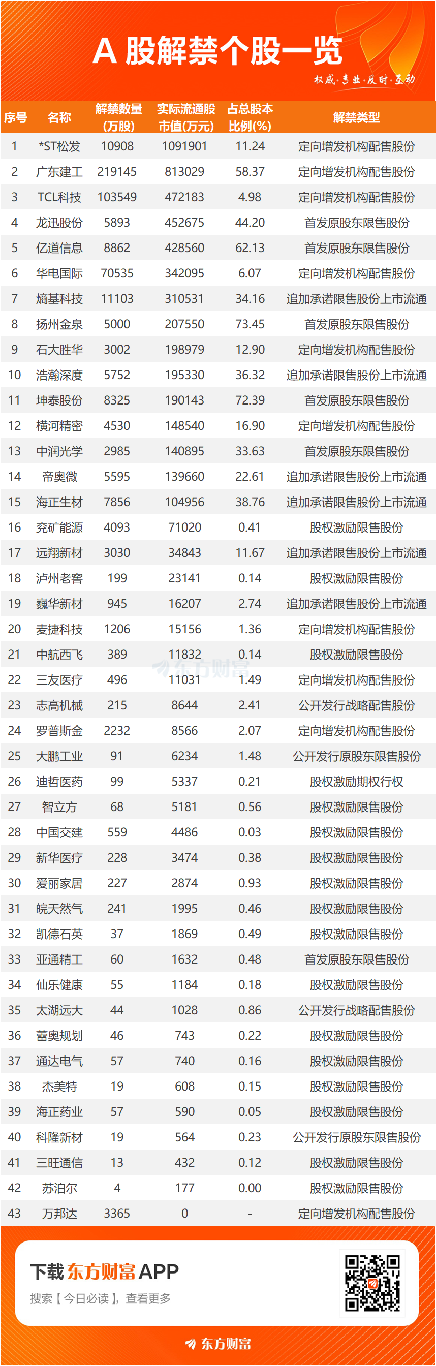 从解禁市值看,东方财富Choice数据显示,下周一面临解禁的43只股票中,*ST松发、广东建工、TCL科技解禁市值居前,解禁市值分别为109.19亿元、81.30亿元、47.22亿元。解禁比例方面,扬州金泉、坤泰股份、亿道信息分别为73.45%、72.39%、62.13%,居于前列。