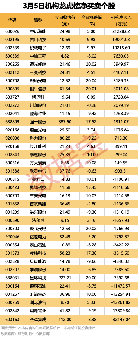 今日龙虎榜中,净买入个股有17只,净卖出的个股为19只。13股净买入金额均超千万元,中远海能获机构净买入2.12亿元,居首;其次是岩山科技,机构净买入金额为1.9亿元。