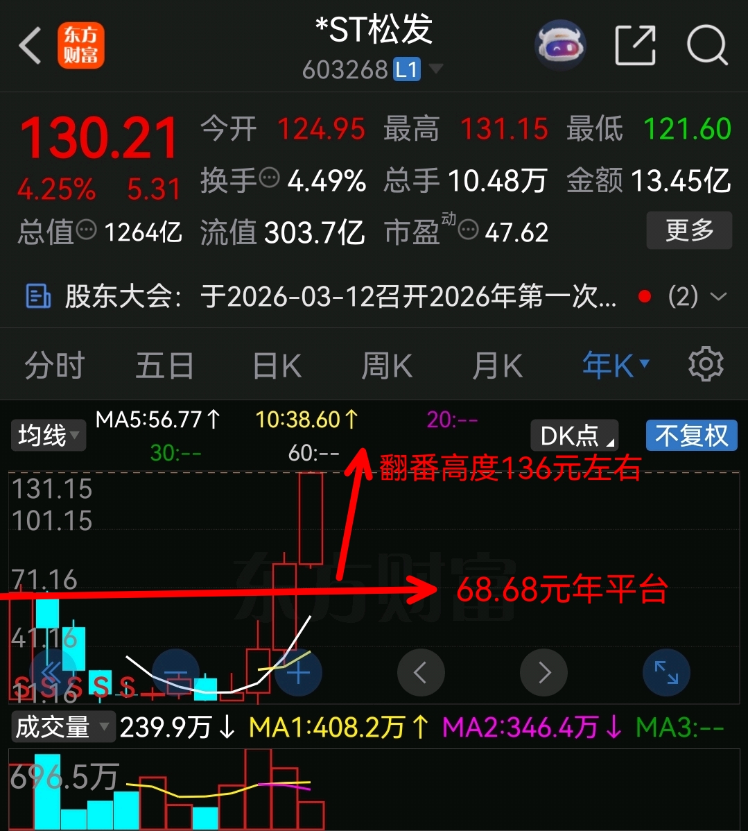 如松发冲击三倍高度计算是206元左右,那么他会调整到103元左右支撑,然后再冲击206元,现在130元如做极致达到阶段任务看看冲击136—140或惯性以上?越涨越卖……