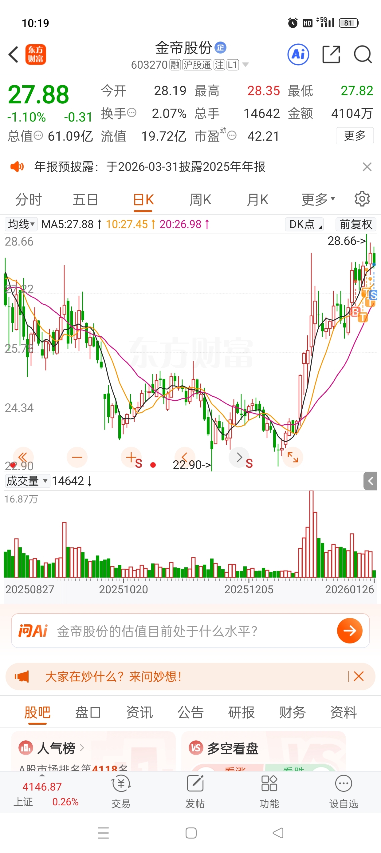 $金帝股份(SH603270)$ 我是磨不赢你3个点不亏拜拜,