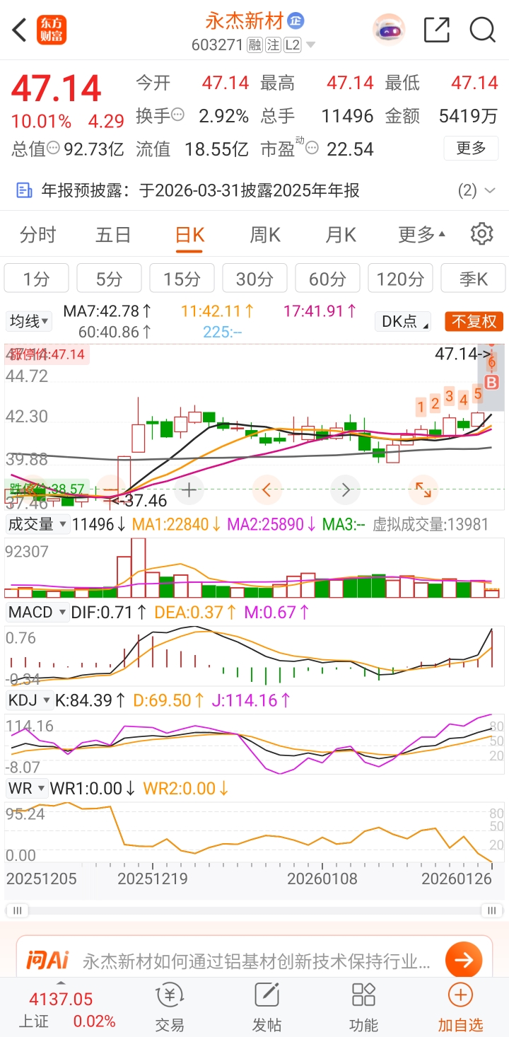 $永杰新材(SH603271)$ 目前持仓亏5元!这个封单量……要求不高,三班组也行