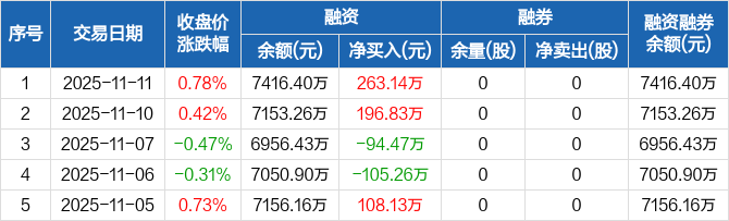 天元智能:融资净买入263.14万元,融资余额7416.4万元(11-11)