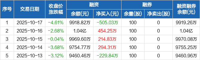 众辰科技:融资净偿还505.03万元,融资余额9918.82万元(10-17)