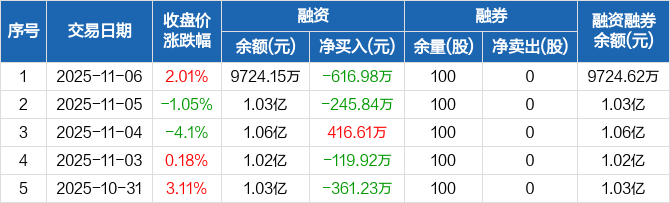 众辰科技:融资净偿还616.98万元,融资余额9724.15万元(11-06)