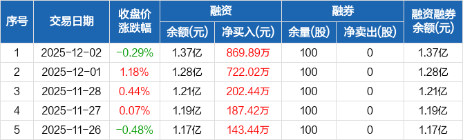 融资方面,当日融资买入1536.51万元,融资偿还666.62万元,融资净买入869.89万元,连续12日净买入累计4370.66万元。融券方面,融券卖出0股,融券偿还0股,融券余量100股,融券余额4188元。融资融券余额合计1.37亿元。