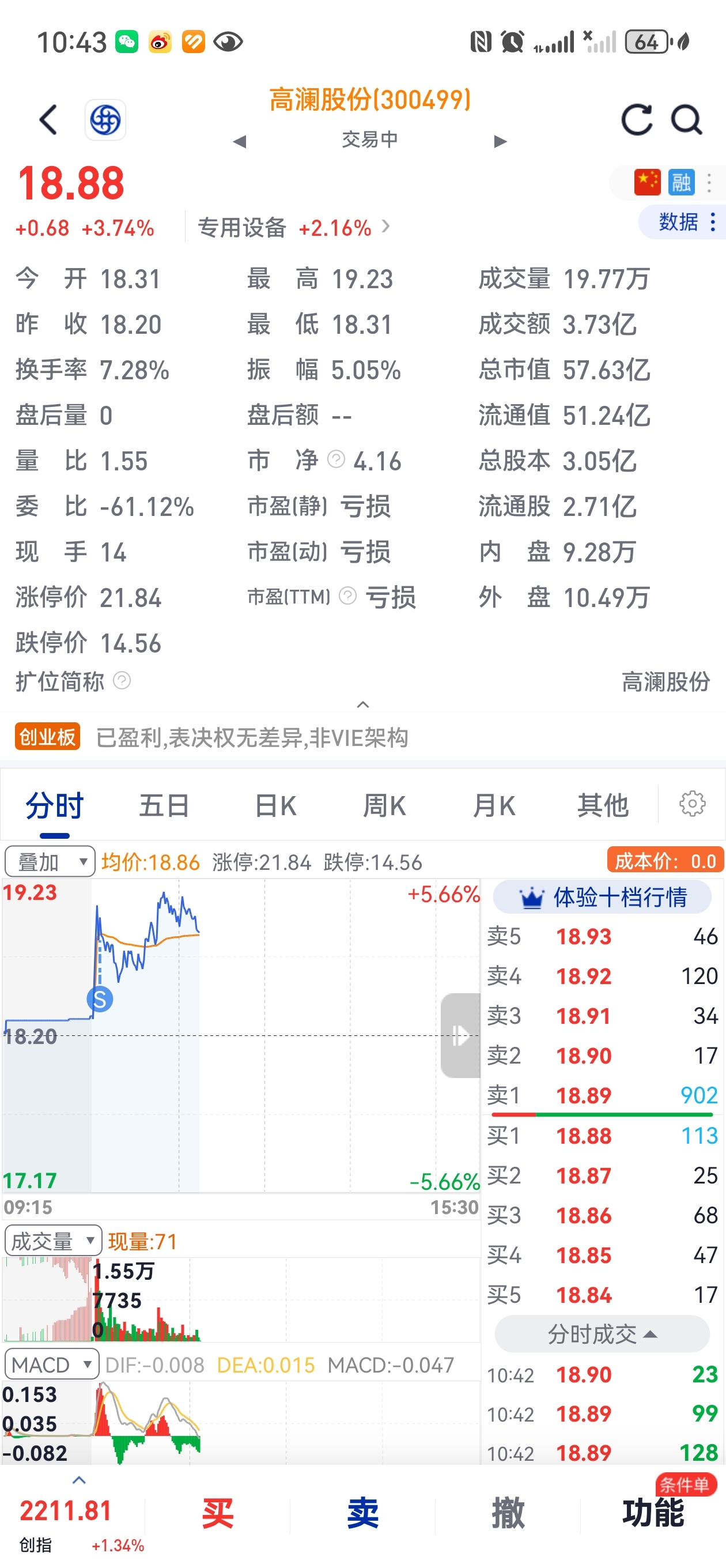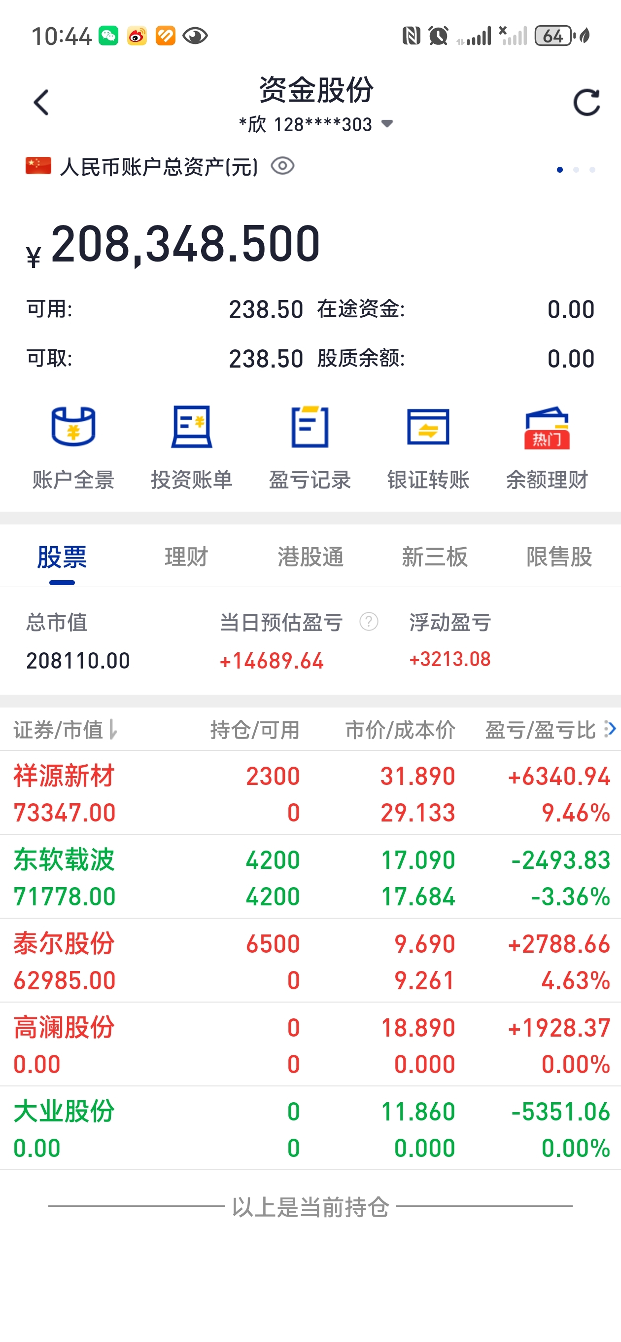 1.周二下午感觉大业股份第二天不会立马拉,先减仓百分之60,买入高澜股份,感觉周三高澜应该能吃三五个点套利,今天开盘发现东华软件集合竞价不行,于是冲高4个点不到卖出高澜股份