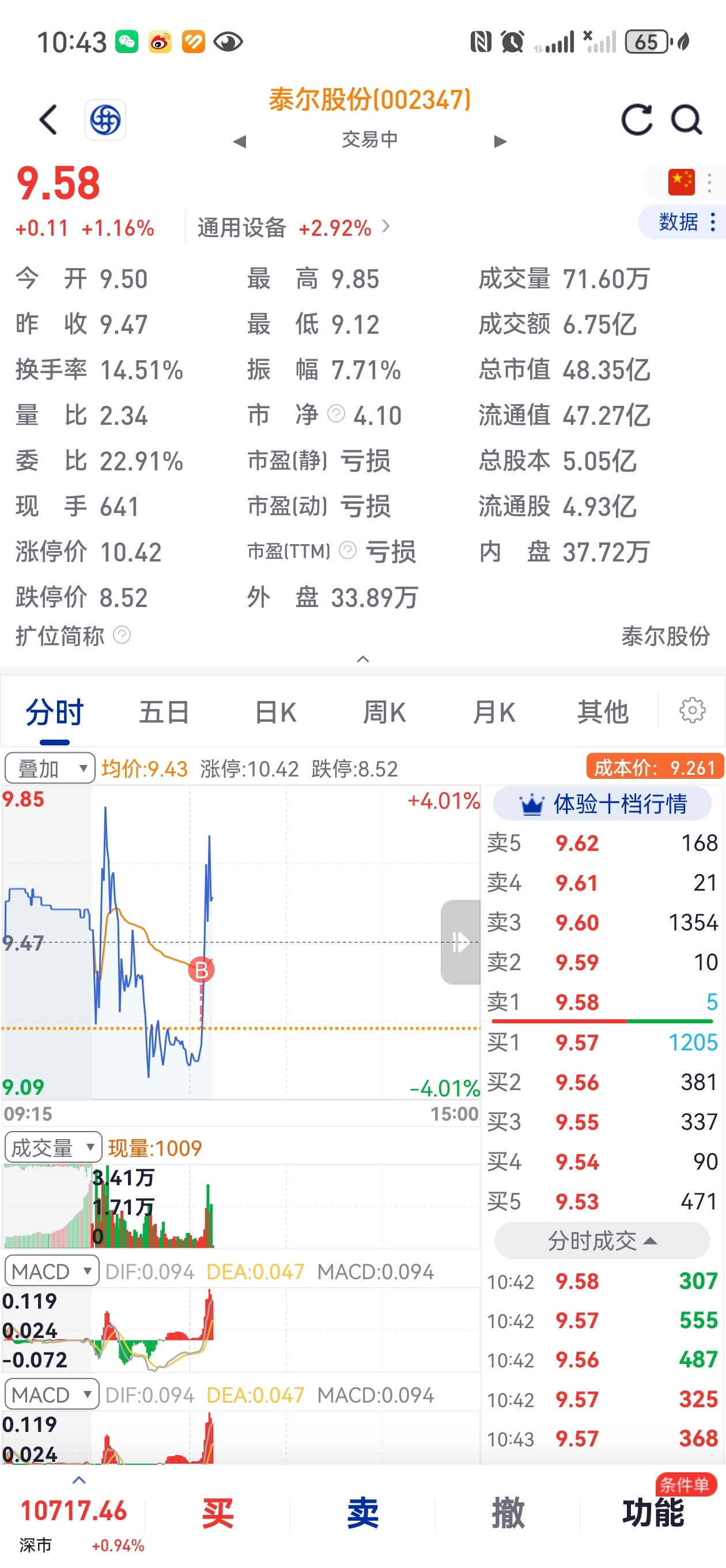 3、剩下的大业仓位观察了一会,它是键绳分支里后排了,有那么一会上冲量能不足,看到泰尔股份水下资金一直在吸,一直在打压,直接水下2.53个点切换到泰尔股份了!